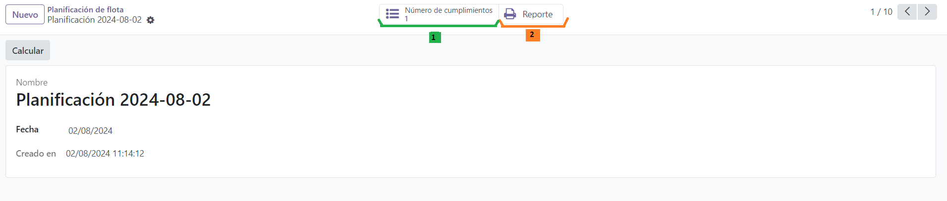 - Calcular: Hacer clic para calcular los tiempos de cumplimientos. Esto podrá visualizarlo siguiendo los pasos de la sección de esta página en Acciones de Planificación de flota > 1. Número de Cumplimientos.