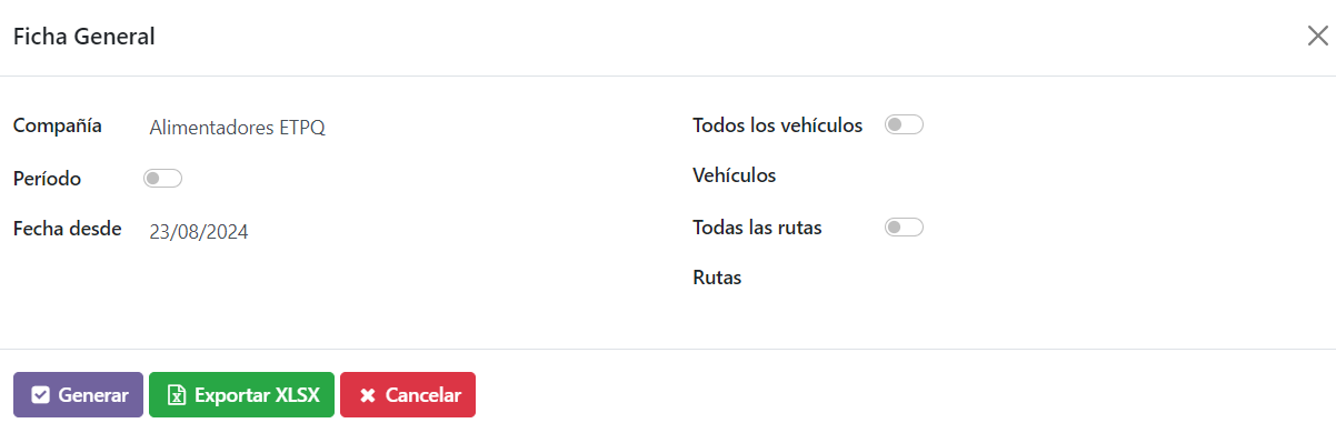 Es un reporte de operación global que se toma en cuenta para la flota. Al hacer clic en "Reporte de Ficha General", se abre una ventana en la que se deben completar los campos mostrados, asegúrese de ingresar todos los datos correctamente para obtener un informe preciso y detallado con la información de la flota.